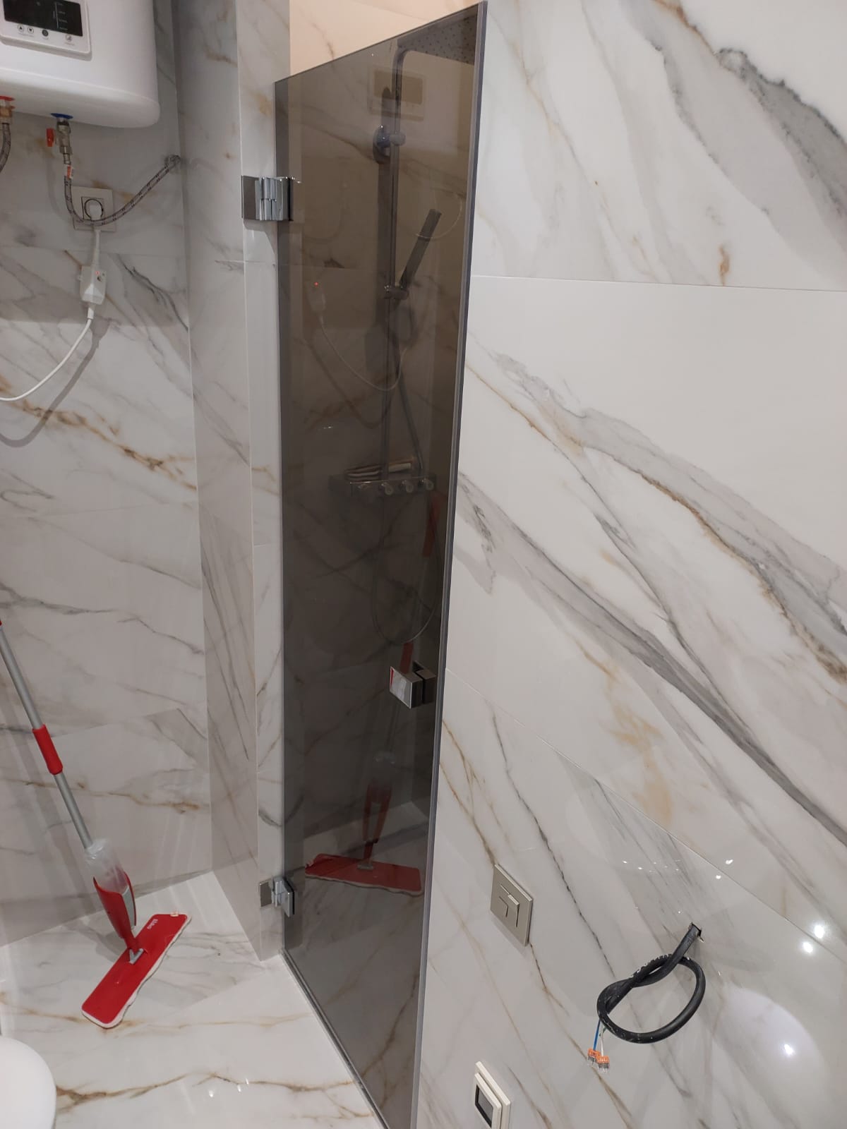 Стеклянная душевая дверь в ванную комнату. Состоит из одного стекла, то есть изделие - только одна дверь, без доборов. Стекло - 8 мм, закаленное, прочное, травмобезопасное, с гидрофобным покрытием, нанесенным на производстве. При разбитии стекло распадается на очень маленькие кусочки, что не позволяет травмировать человека. Фурнитура - коннекторы, петли, П-образный профиль, стабилизационная штанга, магнитные уплотнители и т.д. Используемые ручки - скоба и кноб.
